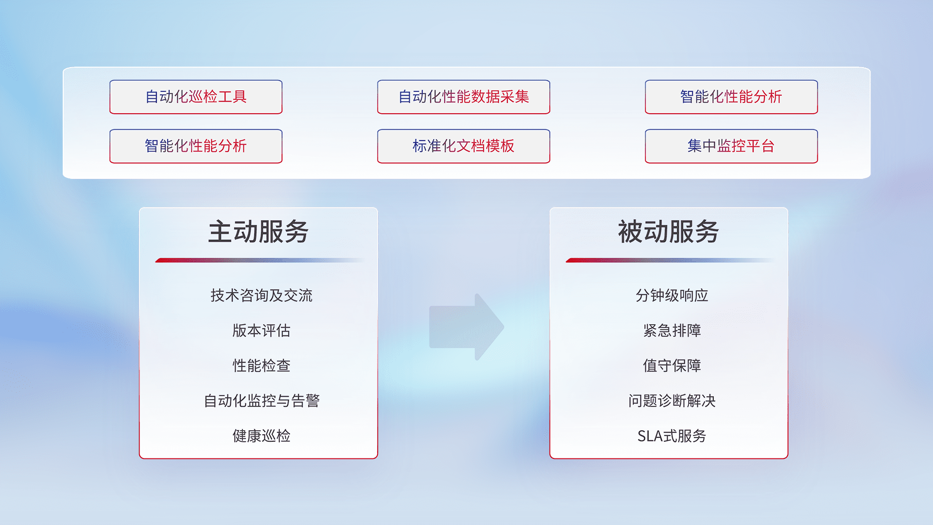 智能化工具和标准化文档,,保障服务质量,,,,提供主动服务(包含技术咨询、、、、版本评估、、、、性能检查、、自动化监控与告警、、、、健康巡检)和被动服务包含(分钟级响应、、、、紧急排障、、、、值守保障、、问题诊断解决、、、、SLA服务)。。