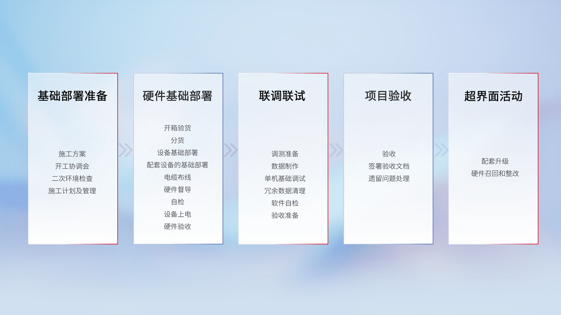 从基础部署准备、、、硬件基础部署、、联调联试、、项目验收、、越界面活动的全过程可追溯,,,保证施工质量和进度。。。