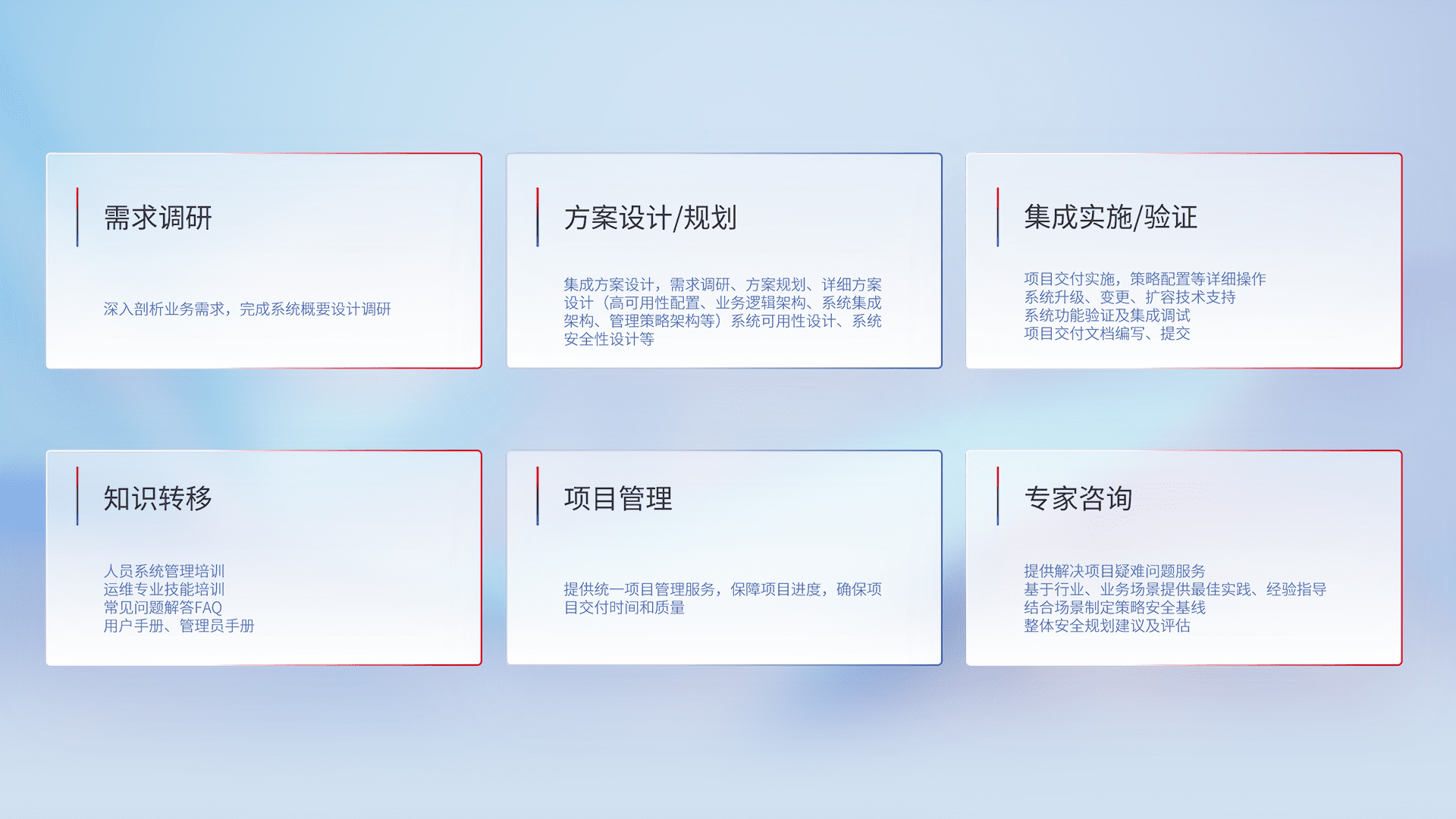 针对客户行业特性,,,,将宏观的安全战略和需求,,,,通过专业的交付服务,,实现项目落地,,为客户提供标准规范的集成交付服务。。。。